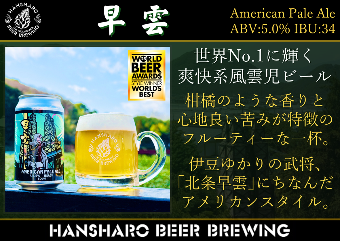 反射炉ビヤのフラッグシップである「太郎左衛門」のイングリッシュペールと飲み比べることで、それぞれの美味しさを味わっていただくことが可能と考え、2015年より定番ラインナップに加わりました。個人でビールを製造し、米国でクラフトビールを普及させたホームブルワー(※)たちへの敬意を、一介の素浪人から伊豆・相模全域を領有する戦国大名となったといわれる、下克上の代名詞でもある北条早雲の名に表しました。