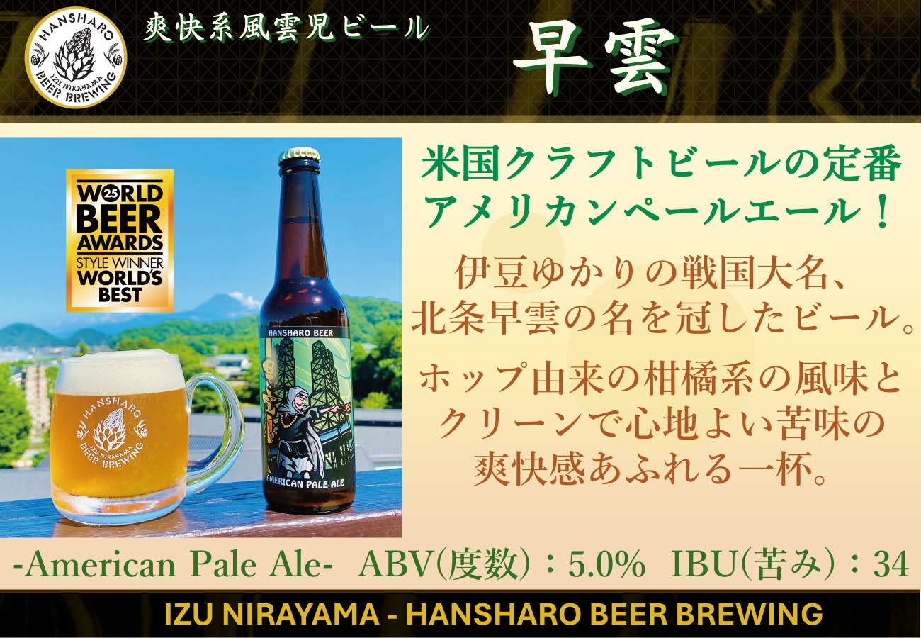 反射炉ビヤのフラッグシップである「太郎左衛門」のイングリッシュペールと飲み比べることで、それぞれの美味しさを味わっていただくことが可能と考え、2015年より定番ラインナップに加わりました。個人でビールを製造し、米国でクラフトビールを普及させたホームブルワー(※)たちへの敬意を、一介の素浪人から伊豆・相模全域を領有する戦国大名となった下克上の代名詞でもある北条早雲の名に表しました。