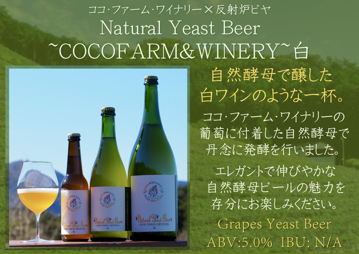 第1弾は白ワイン銘柄に使用されるドイツ品種の白葡萄“ケルナー”を使用!ワインでも珍しい白葡萄での「醸し発酵」をビール醸造に取り入れることによって、エレガントで白ワインのような自然酵母ビールが出来上がりました。