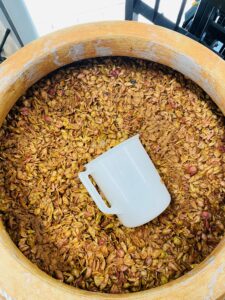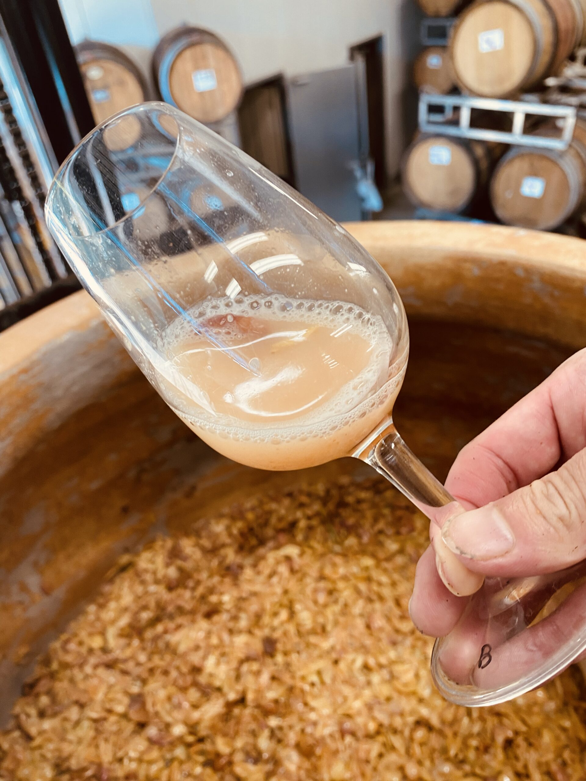 僕は学生の頃からココ・ファーム・ワイナリーさんの「甲州F.O.S.」という甲州ブドウを醸し発酵させるオレンジ色のワインが大好きで、初めて口にした時は、恐らく極限まで果皮成分を抽出させたであろう力強い印象に、ある種のロマンを感じたことを覚えています。そんなことから今年もコラボを行わせていただくにあたり、「醸し発酵」をテーマにビール造りを行いました。