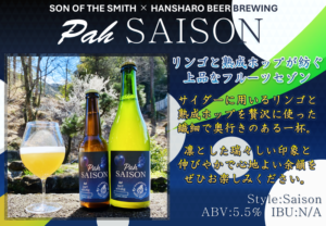 Son of THE SMITHでハードサイダーに使用したりんご“グラニースミス”の搾りカス(Pomace)と醸造責任者の“ハカセ”が作り出す熟成ホップ(Aged Hop)を使用することでフルーティーなアロマと共に口当たりの良い収斂味が感じられる、繊細でありながら奥行きのあるセゾンビールを目指しました。